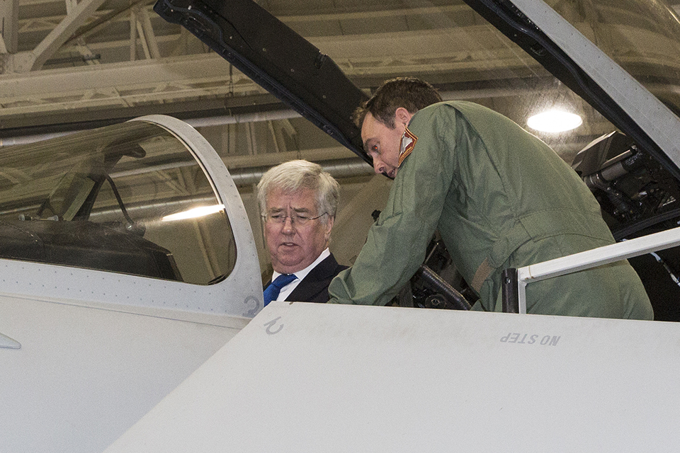 The Defence Secretary is shown around the cockpit of a Typhoon aircraft by Wing Commander Sutton, Officer Commandng 1 Squadron, at RAF Lossiemouth [Picture: Senior Aircraftwoman Tracey Dobson, Crown copyright]