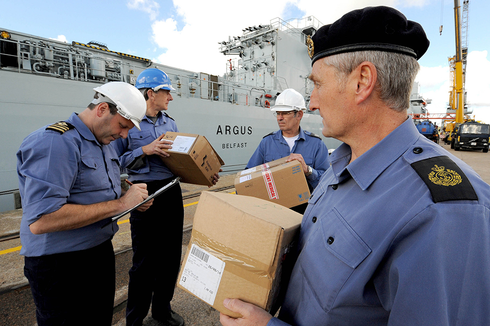 RFA Argus Executive Officer, Chief Officer Shane Wood checks the first load of medical supplies to arrive for RFA Argus [Picture: Petty Officer Airman (Photographer) Paul A'Barrow, Crown copyright]