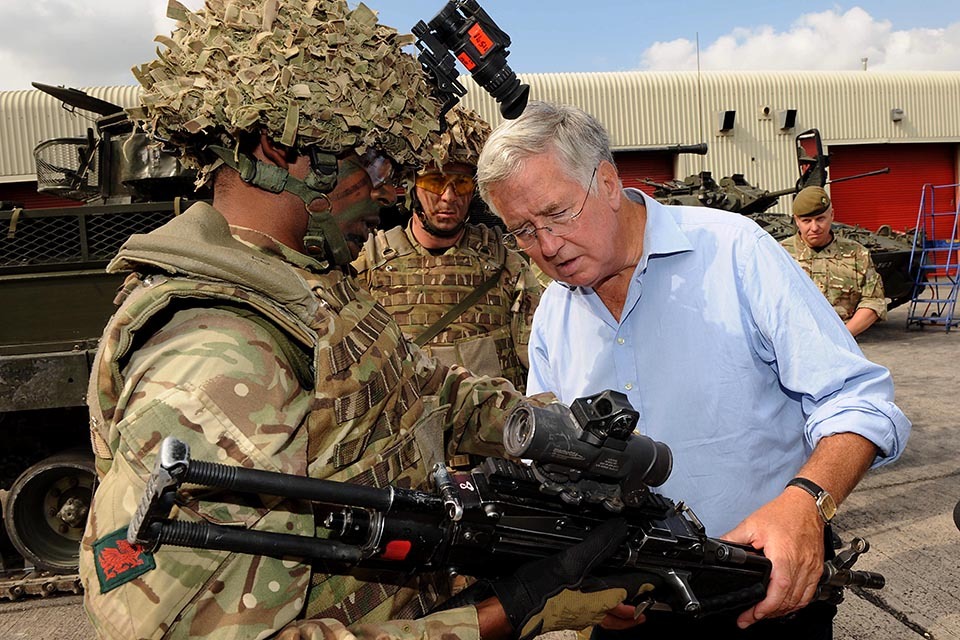 A soldier from 1st Battalion The Royal Welsh shows Michael Fallon one of the weapons he will be using on the exercise [Picture: Richard Watt, Crown copyright]