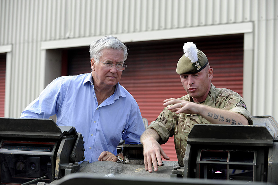 Sergeant Simon Ashton from 1st Battalion The Royal Welsh explaining the Warrior armoured fighting vehicle to Michael Fallon [Picture: Richard Watt, Crown copyright]