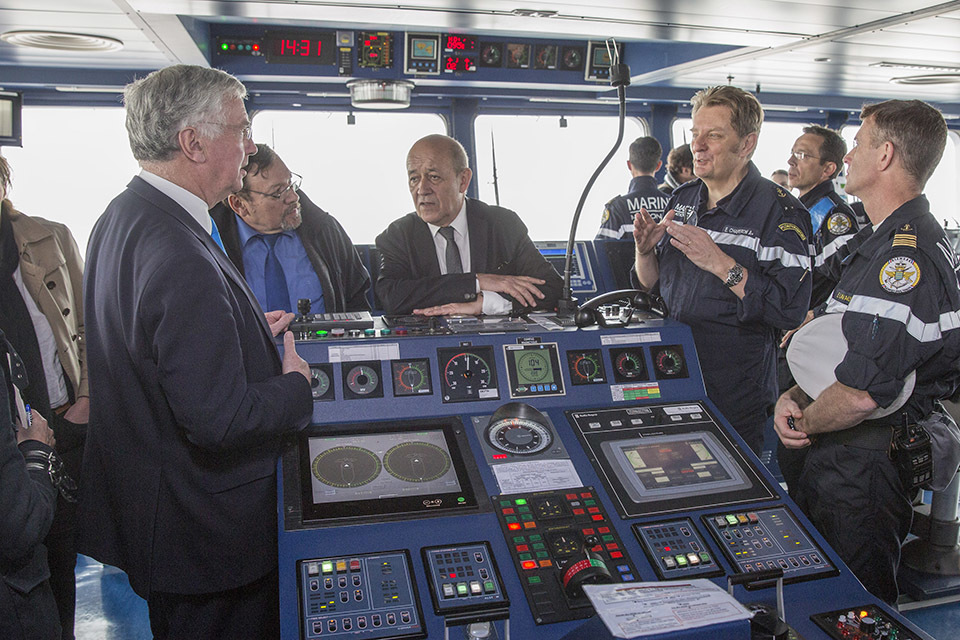 Michael Fallon and Jean-Yves Le Drian on FS Dixmude. Crown Copyright.