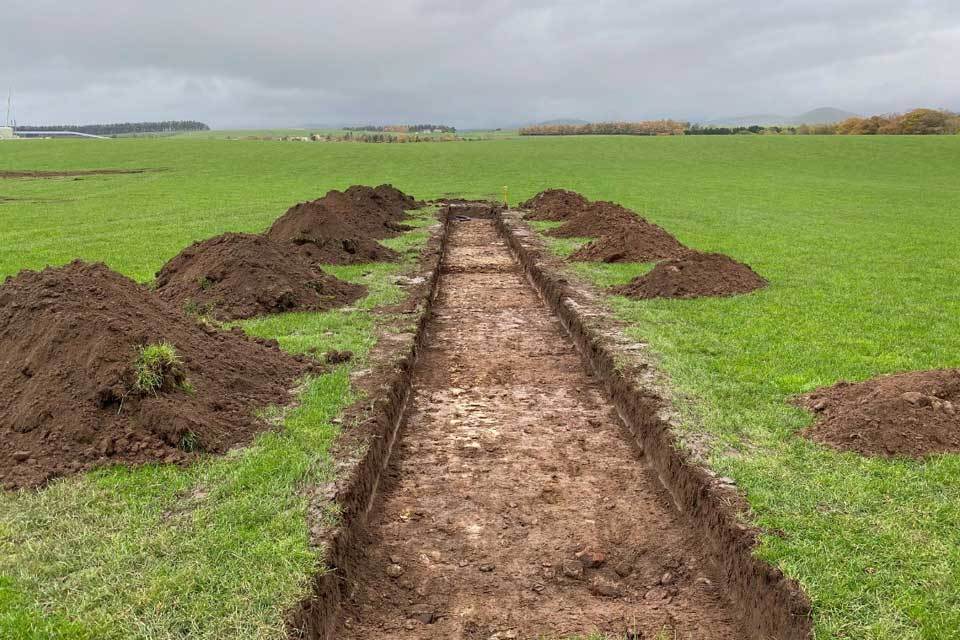 The trenches are 30m in length and 2m wide. The machine excavation goes to a depth of 300m to 600mm with hand excavation reaching 1.2m below existing ground level.