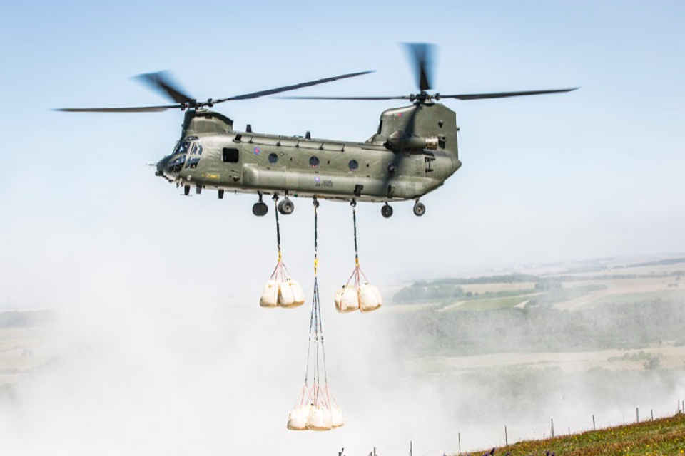 A Chinook delivers bags of chalk to re-chalk the kiwi for the first time in 30 years. Crown Copyright.