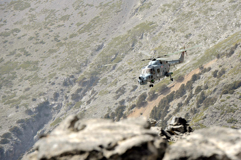 HMS Dragon's Lynx helicopter conducting mountain flying training on the slopes surrounding Souda Bay, Crete [Picture: Leading Airman (Photographer) Dave Jenkins, Crown copyright]