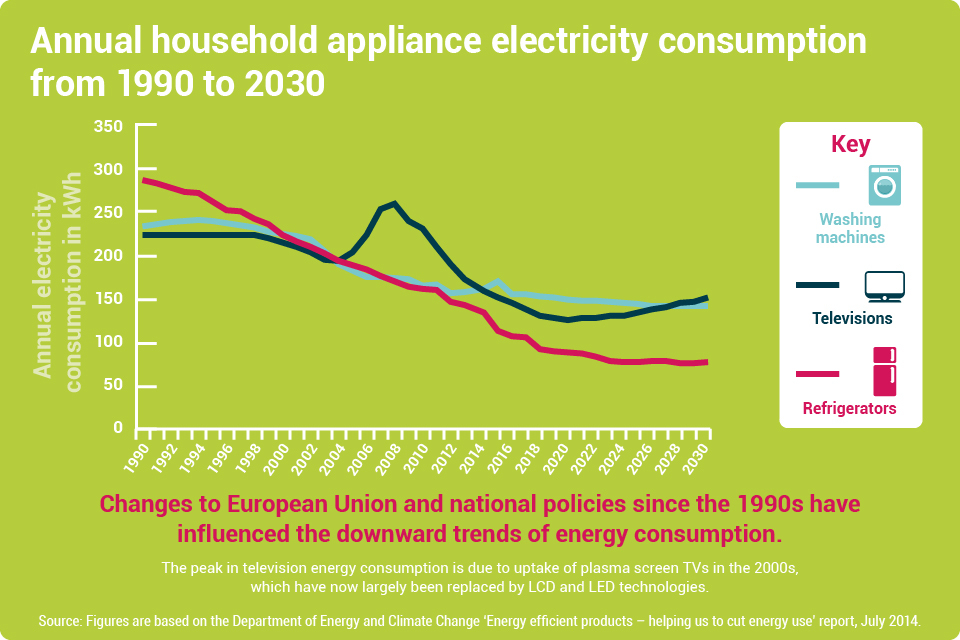 Infographic: Annual household appliance electricity consumption, 1990 - 2030.