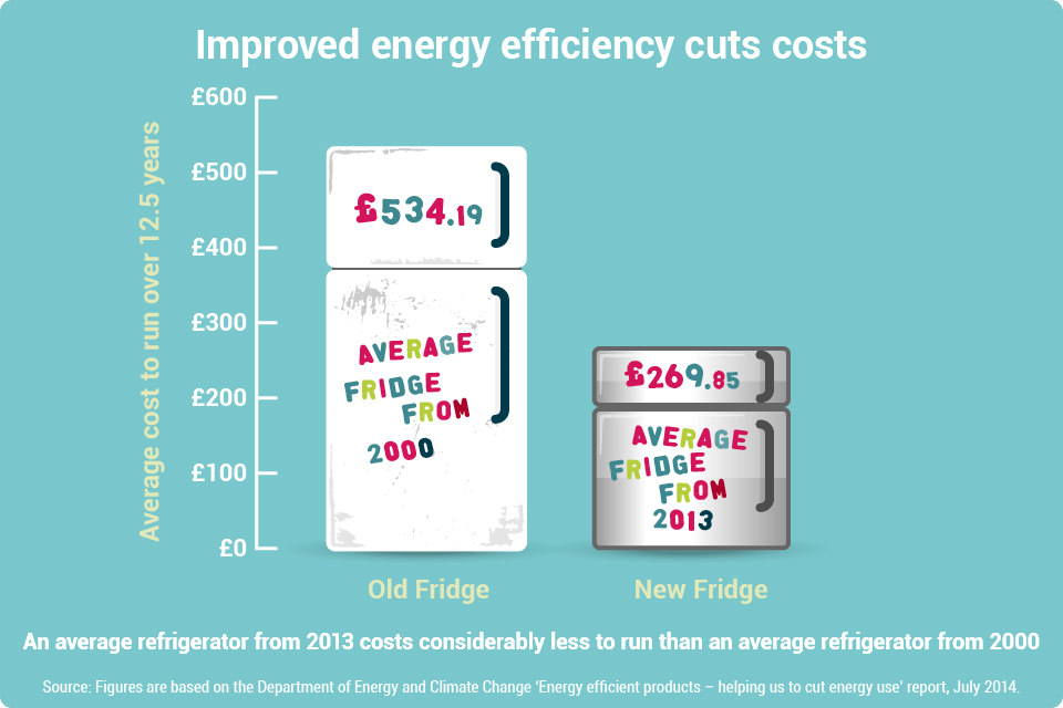 A typical family will upgrade its fridge and washing machine every 12 and a half years. Thanks to higher product standards, households are naturally buying more efficient products every time they upgrade their appliances. This means that a typical family would have paid around £25 less in electricity costs to run their fridge and washing machine last year compared to what they would have paid at the turn of the century. And, with the price of appliances becoming cheaper and cheaper, buying these products in 2013 would have cost households around £250 less than if they purchased equivalent models in 2000 or 2001.