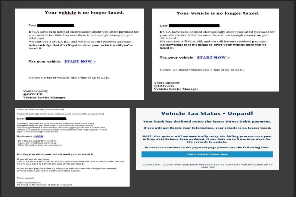The scams ask drivers to verify their driving licence details, offer vehicle tax refunds, highlight a failed vehicle tax payment and ask for bank details.