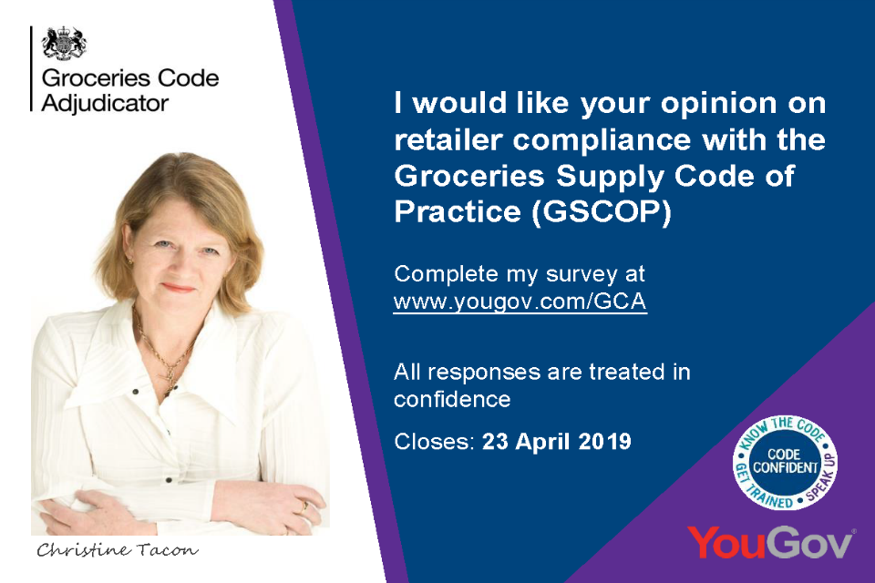 There is now an opportunity for all suppliers to tell me about their experiences with all the regulated retailers. My sixth annual survey is currently underway and open until 23 April. You can respond to it at www.yougov.com/gca. Please take the time to complete it because it helps shape my work for the coming 12 months as well as alert me to any emerging issues and developments.