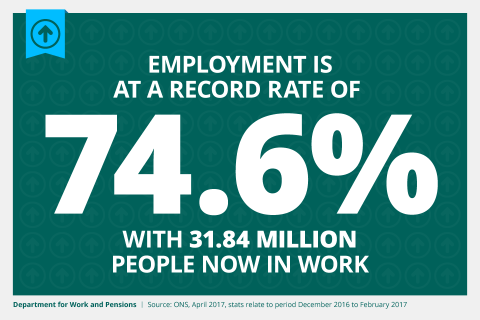 Official figures released today (12 April 2017) show that the employment rate is at 74.6%, with 31.84 million people in work – an increase of 312,000 on the year and the joint highest rate since records began in 1971.