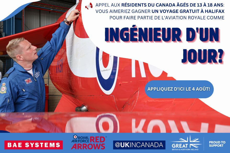 Le concours « Ingénieur d’un jour » est une opportunité passionnante pour les jeunes résidant au Canada. Le ou la gagnant(e) se rendra en Nouvelle-Écosse en août pour passer un week-end avec la patrouille acrobatique de l’Aviation royale britannique, les Red Arrows. Si vous avez entre 13 et 18 ans et que vous résidez au Canada, nous voulons avoir de vos nouvelles!