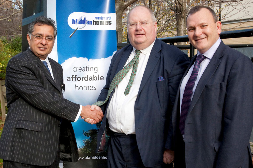 Wandsworth Council Leader Ravi Govindia and Councillor Paul Ellis welcome Eric Pickles to the borough to officially unveil the new Hidden Homes