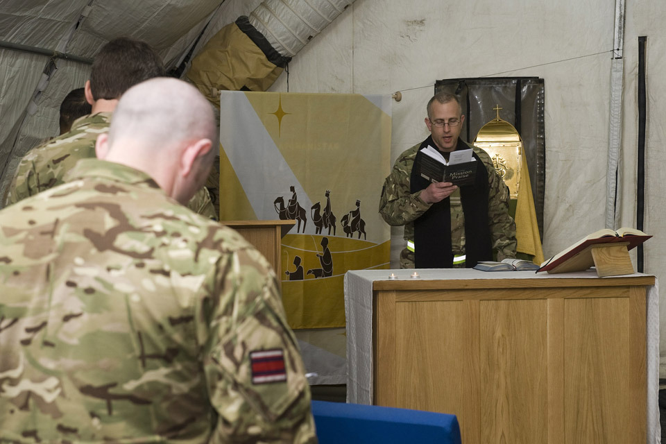Reverend (Flight Lieutenant) Matt Buchan taking a service inside the St Michael's and All Saints Garrison Church at Camp Bastion [Picture: Corporal Jamie Peters, Crown copyright]