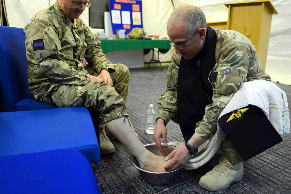 Reverend (Flight Lieutenant) Matt Buchan washes the feet of a serviceman at Camp Bastion [Picture: Corporal Jamie Peters, Crown copyright]