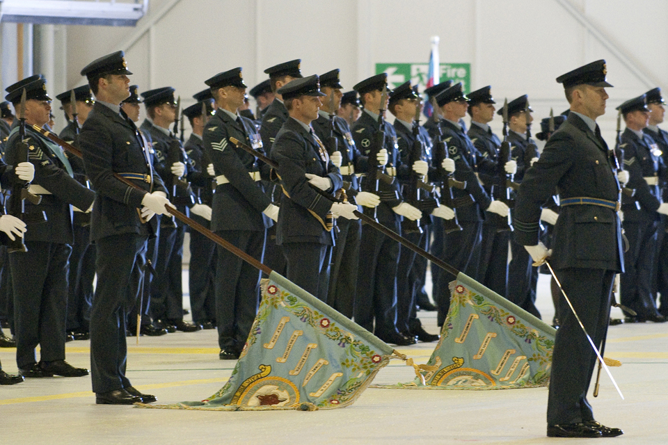 The standards of 12 (Bomber) and 617 Squadrons are lowered during the disbandment ceremony [Picture: Sergeant Stu Fenwick RAF, Crown copyright]