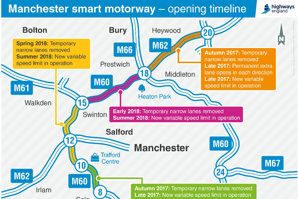 The first sections to complete will be along a 5 mile stretch of the M62 near Rochdale and on a 2 mile stretch of the M60 near the Trafford Centre.