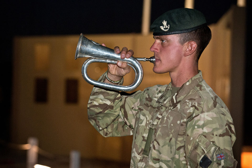 A soldier plays the Last Post at the ceremony at Camp Bastion marking 100 years since Britain entered the First World War [Picture: Corporal Daniel Wiepen RLC, Crown copyright]