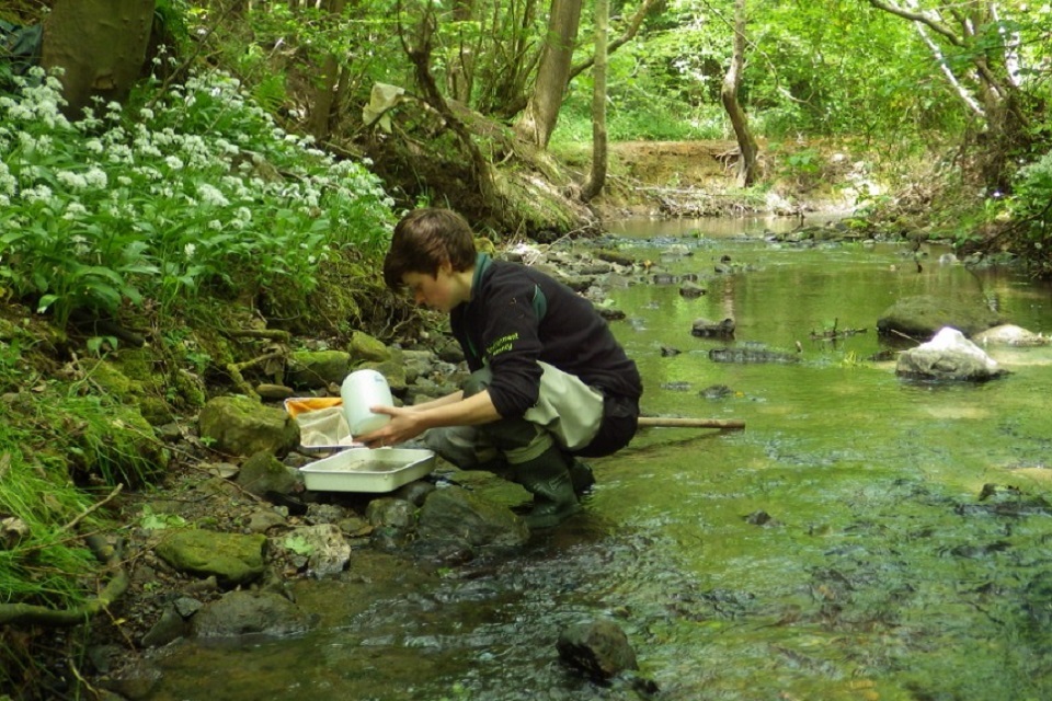 Image shows the Environment Agency's Jess Anson carrying out a survey at Saltburn Gill