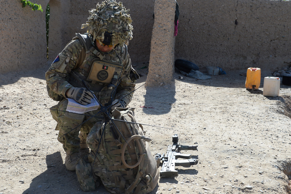 A soldier on operations in Afghanistan using the PRC-177F tactical satellite radio [Picture: Sergeant Barry Pope RLC, Crown copyright]