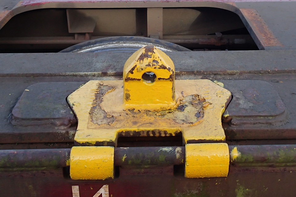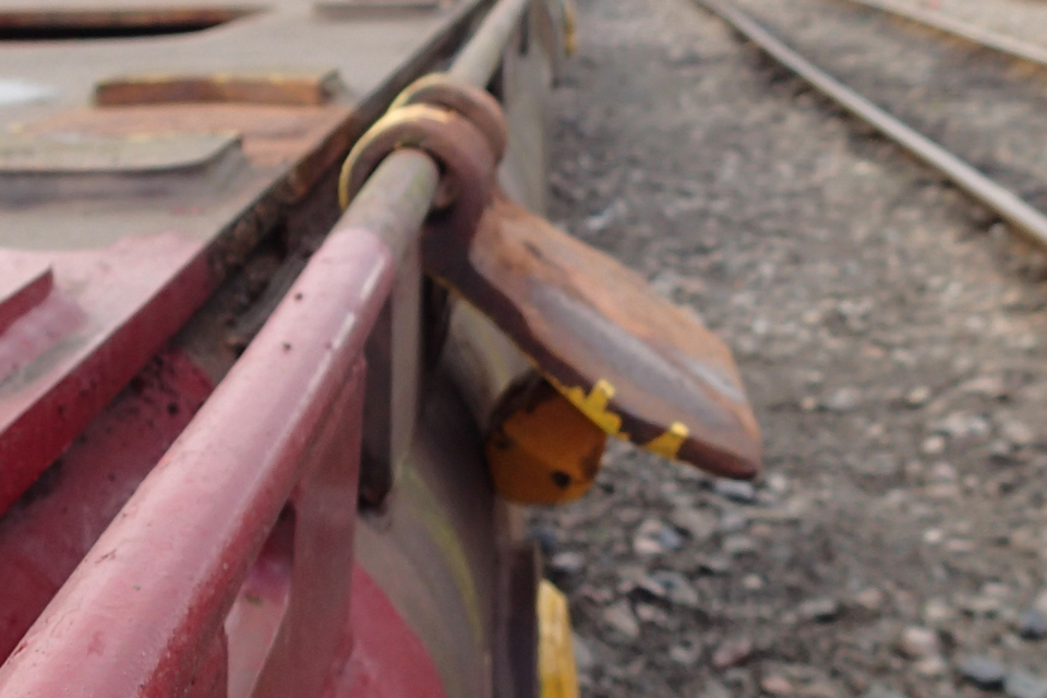 About 14 minutes before the accident involving the passenger train, the 03:57 hrs DB Schenker freight train service from Warrington Arpley to Doncaster (reporting number 6E33) had passed through the same platform. The RAIB’s preliminary examination has identified that two incorrectly stowed container fixings (hinged spigots) on the rear wagon of this train, an empty FKA type container wagon, had struck the platform and displaced the coping stones. This type of hinged spigot is attached to a bar on the side of the wagon and can be slid along the bar to accommodate different sized containers. When correctly stowed as required for operation on the rail network, the spigots should be rotated to rest within a locating recess on top of the wagon. At the time of the accident the spigots which struck the platform were hanging down on the sides of the vehicle and projecting beyond the usual wagon width.