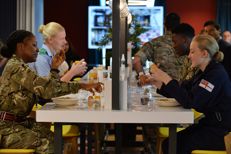 Diners, in military uniform, from all 3 services eat in the new cafe. The cafe looks clean and modern with long white communal tables and yellow seating.