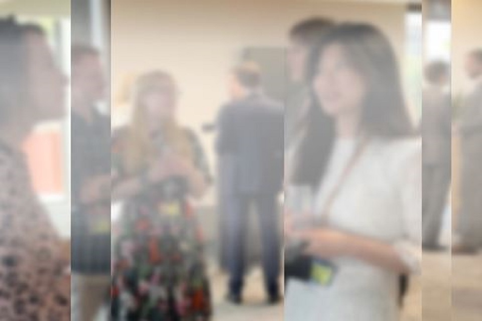 Image of people standing and chatting. The image is blurred as if it has been taken through thick glass.