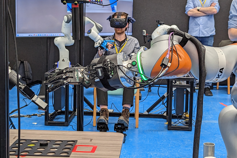 At the demo day, BOW showcased their solution comprising of a robot with omnidirectional wheels, adjustable height and long arms able to hold objects. The robot is controlled from a cockpit which has a pair of robotic arms that are configured to provide resistive force feedback.