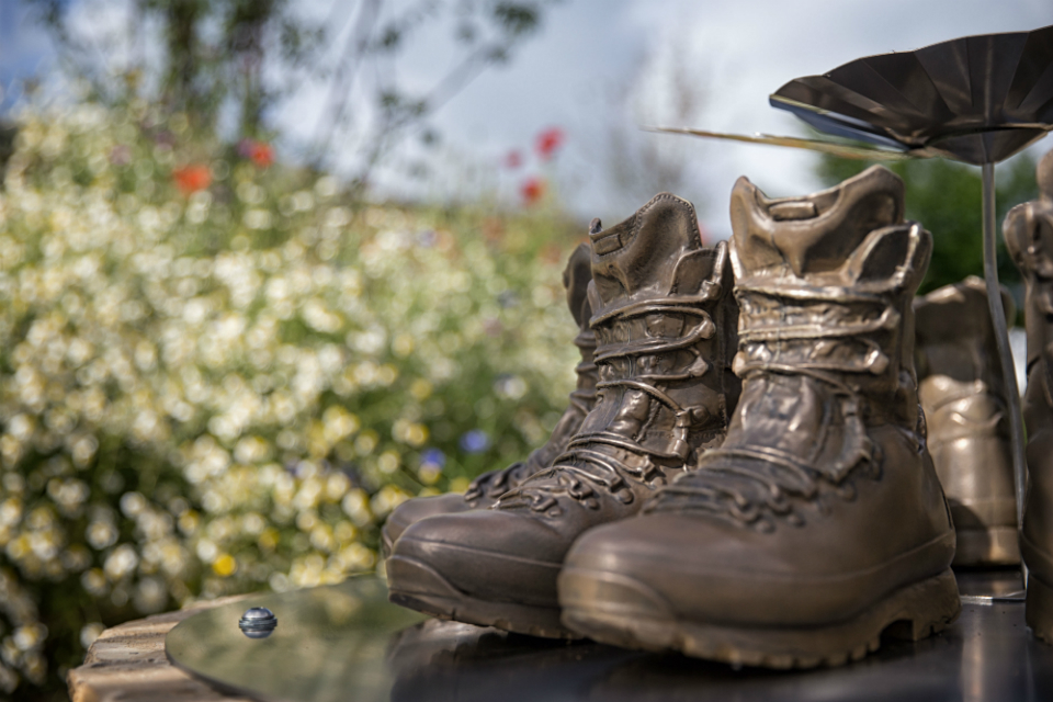 The Garden of Remembrance is based on a design by local horticultural students from Wiltshire College’s Lackham campus. A key part of their design is an image that would be recognisable to all military personnel; their boots. Wild flowers adorn the banks of the contoured garden which also incorporates sand bags and three standing stones of Wiltshire in the colours of the three Services. The garden is profiled to give privacy and some protection from the elements for those visiting and paying their respects to the fallen.