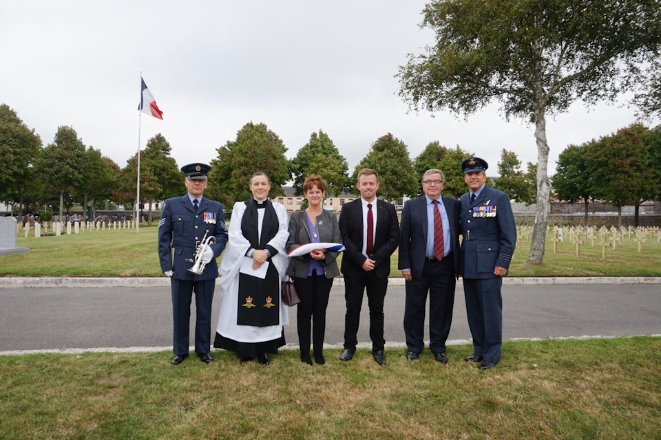 The service, organised by the MOD’s Joint Casualty and Compassionate Centre (JCCC), part of Defence Business Services was attended by FO Stein’s cousin, Carol Taylor who was accompanied by her husband, Stuart Taylor and son, David Taylor. It was led by The Reverend (Squadron Leader) Rachel Cook, RAF. Members of the RAF including the RAF Exchange Officer Wing Commander Yves Gagnon, RAF Exchange Officer French MOD and local dignitaries were also in attendance.