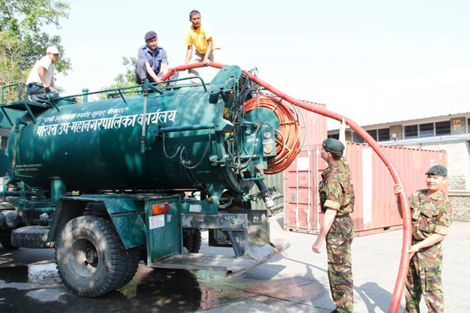 The British Gurkha Camp in Pokhara though has its own water supply, so was therefore unaffected by the flood. The soldiers therefore offered to supply water to the local people outside the camp through filling municipal sponsored tankers as well as allowing people to collect water form the taps at the front and rear of the British camp.