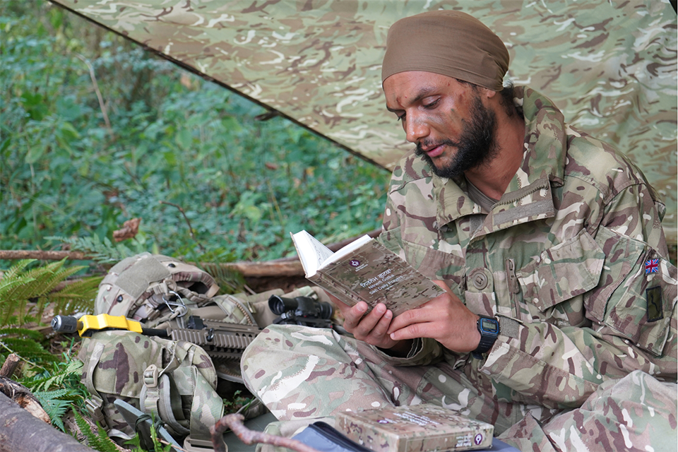 A person sitting outside on exercise in a camouflage uniform, reads the Nitnem Gutka