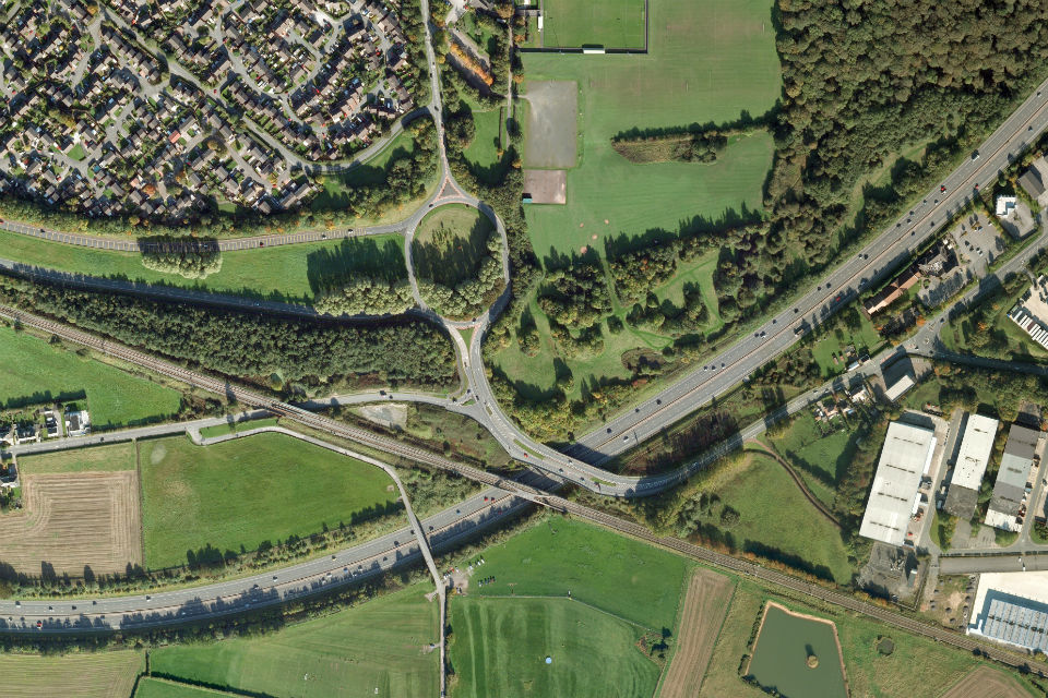 Aerial view of M56 and existing layout of Murdishaw Roundabout along the local road network