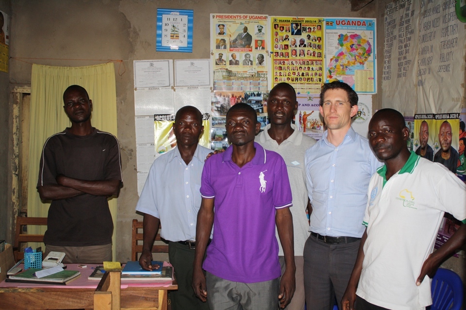 Head of Political, Joseph Bolton with members of the Kagoli Youth Development Association (KAYODA) at their office in Pallisa District