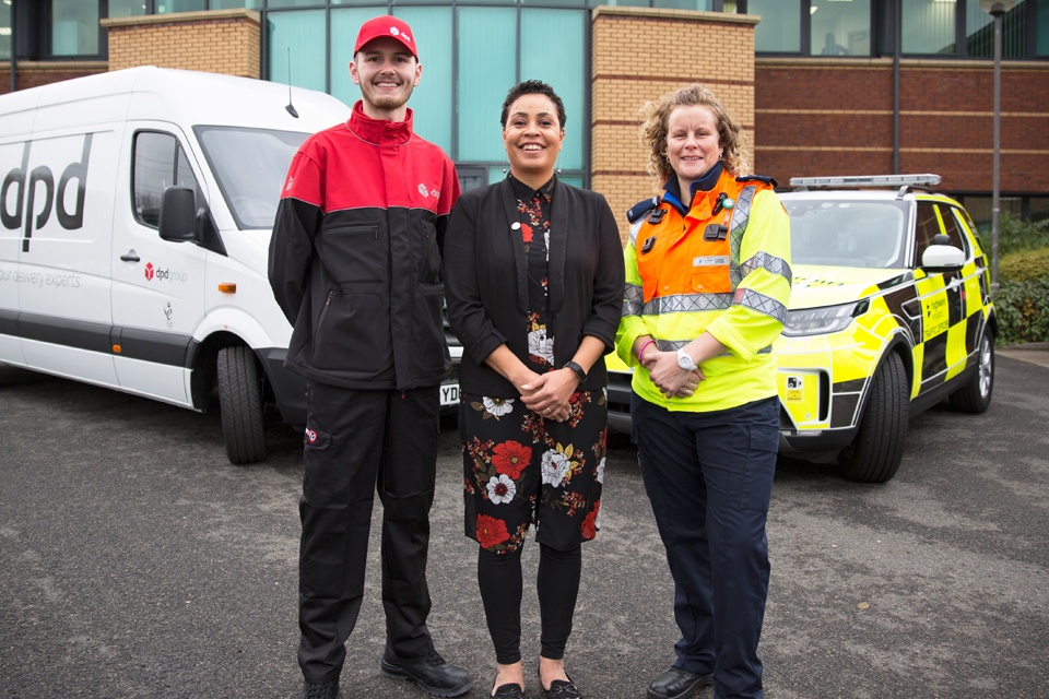 (LtoR): Finn Owens from DPD with Highways England customer service director Melanie Clarke and Highways England traffic officer Vicki Lawton who will be working on Christmas Day to keep traffic moving on the Midlands motorway network.