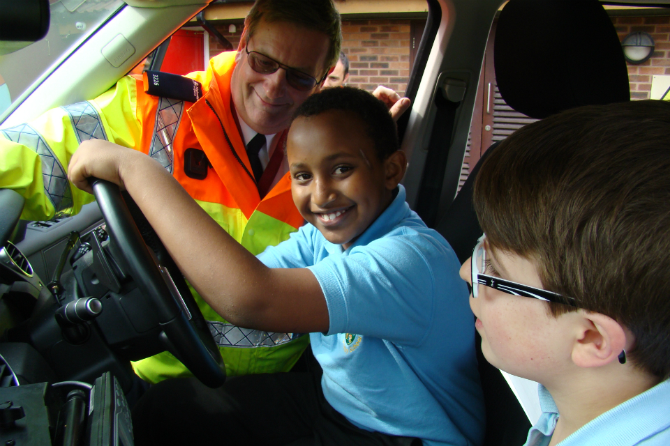 St Werburgh's Primary School pupils get behind the wheel of the Highways England patrol vehicle with traffic officer Nigel O'Regan