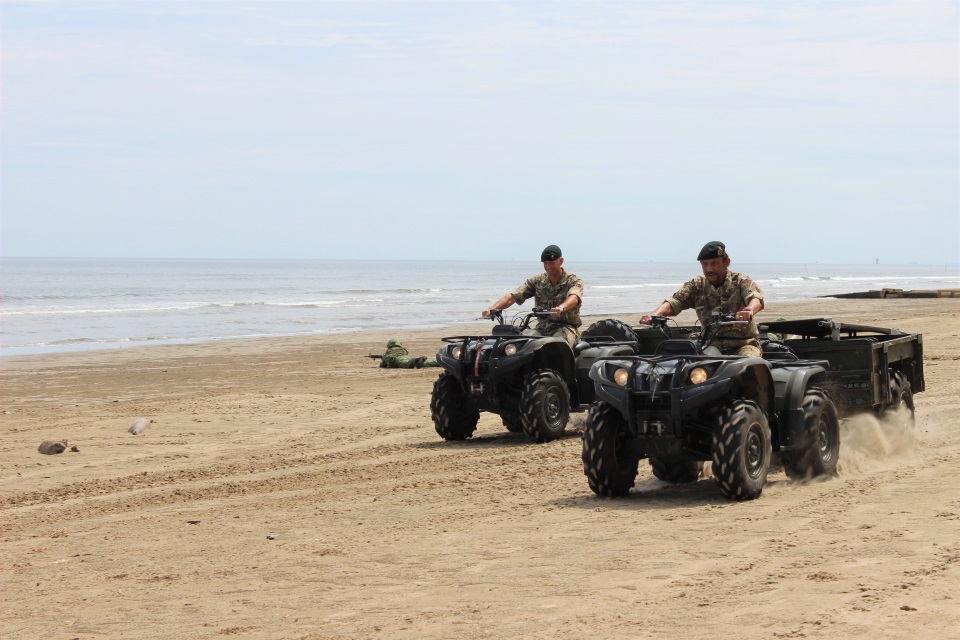 His Majesty then watched a capability demonstration of a Company Raid Operation, made up of members of the Battalion’s Rifle Companies, and Specialist Weapon Platoons including the Reconnaissance Platoon, Snipers, Mortar Platoon, Machine Gun Platoon and Anti Tank Platoon. His Majesty watched the operation unfold on the ground and moved amongst the fighting troops before watching an extraction onto the beach and out to the sea by Rigid Inflatable Boats provided by the Garrison Boat Section. His Majesty was briefed on the British Forces Brunei all-terrain quad bike and had the opportunity to test-drive it on the beach.