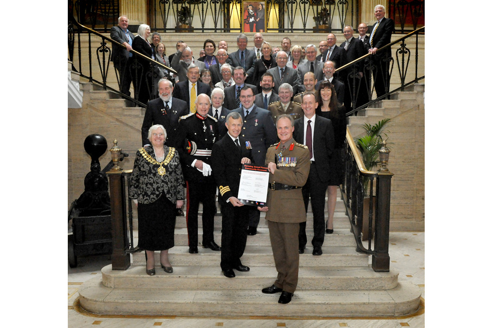 Supporters and signatories of the Armed Forces Community Covenant pose with the signed document at Barnsley Town Hall [Picture: Corporal Gabriel Moreno, Crown Copyright/MOD 2012]