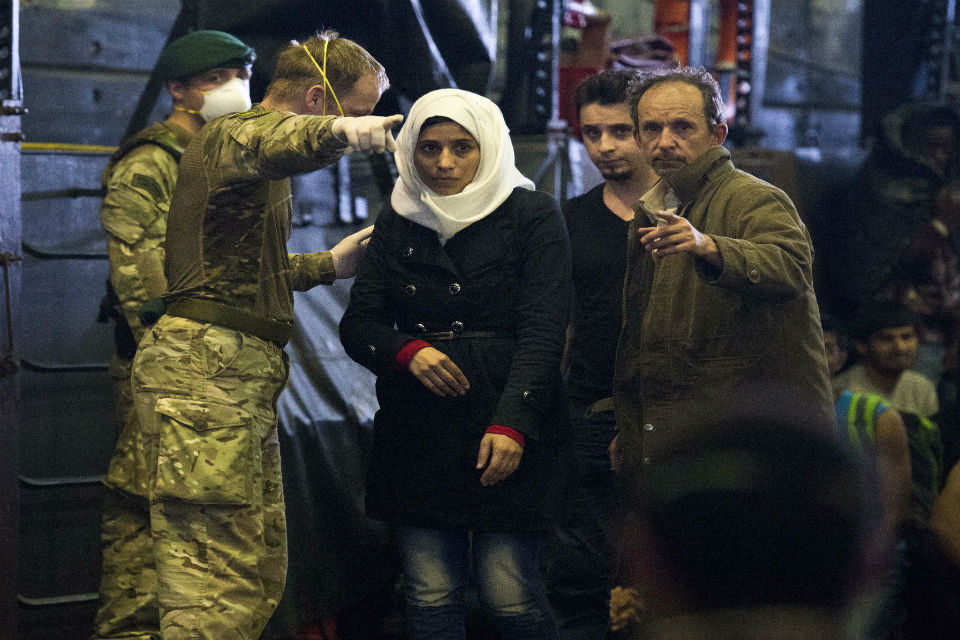 Migrants arrive on HMS Bulwark having been rescued by the Royal Navy in the Mediterranean