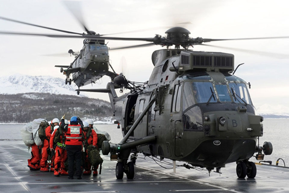 Never an easy manoeuvre given the amount of equipment the commandos carry in their Bergen packs on their backs, the Arctic weather added to the challenges air and flight deck crews faced (operations were temporarily suspended on Monday when a snowstorm swept through the fjords), and the marines had to wear their bright-red watertight suits when flying over the ocean to protect them should the Sea Kings have to ditch.