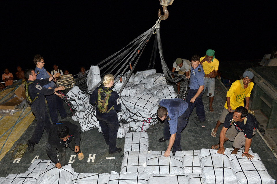 Members of HMS Daring's crew with life-saving humanitarian aid at Cebu [Picture: Able Seaman (Warfare Specialist) Chris Oldland, Crown copyright]