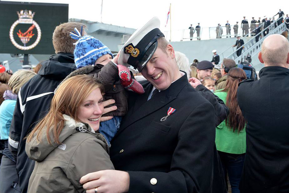 A chief petty officer is welcomed home by his wife and son [Picture: Leading Airman (Photographer) Maxine Davies, Crown copyright]