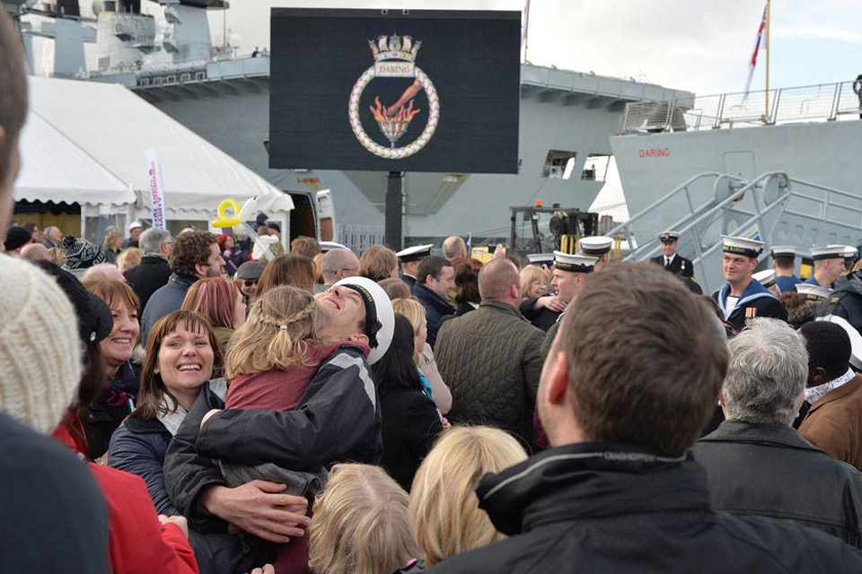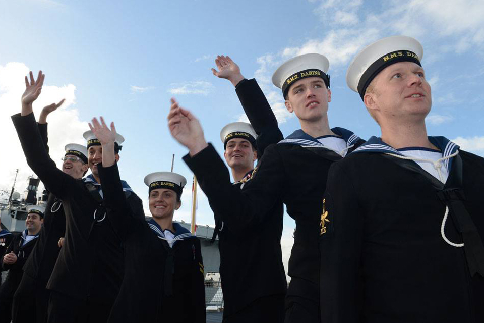 Members of HMS Daring's crew wave to loved ones ashore [Picture: Leading Airman (Photographer) Keith Morgan, Crown copyright]
