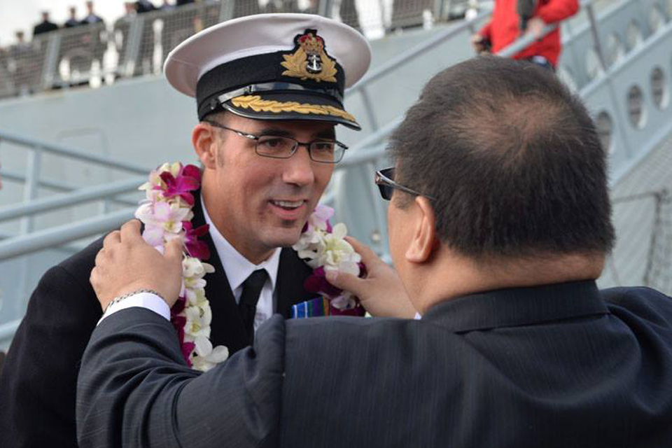The Consul General – who was accompanied by First Secretary and Consul Emma Sarne – presented Commander Essenhigh with a special floral garland as a tribute to his crew’s relief work after the typhoon struck in November.