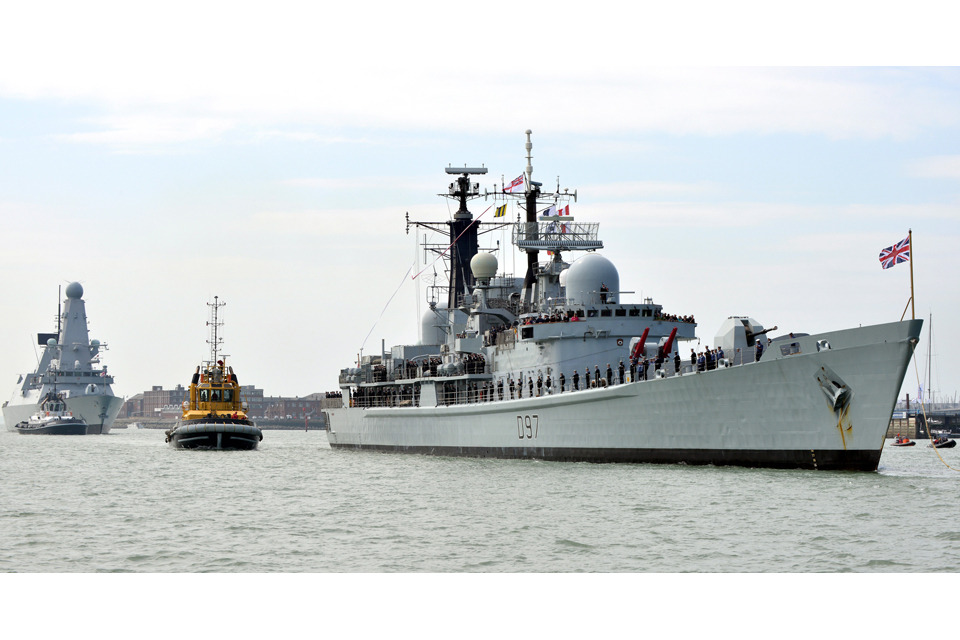 In keeping with Navy tradition the ship was flying a decommissioning pennant on her final return and was accompanied by HMS Defender, one of the Navy’s successor Type 45s.