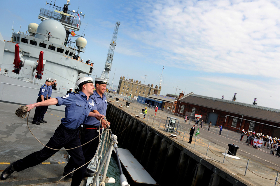 A sailor throws a heaving line as HMS Edinburgh comes alongside at Portsmouth Naval Base for the last time [Picture: Leading Airman (Photographer) Dan Rosenbaum, Crown copyright]