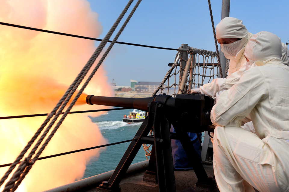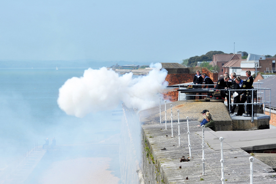 Saluting guns being fired from Fort Blockhouse, Gosport [Picture: Leading Airman (Photographer) Guy Pool, Crown copyright]