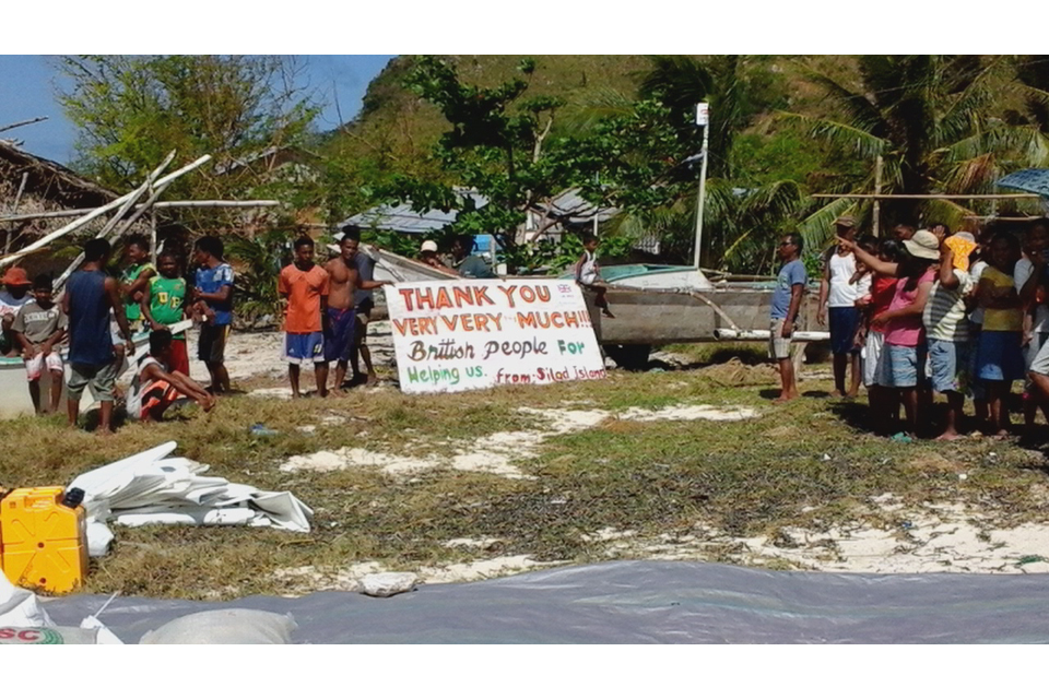 Philippine islanders hold up a sign of thanks to the British people 'for helping us' [Picture: Crown copyright]