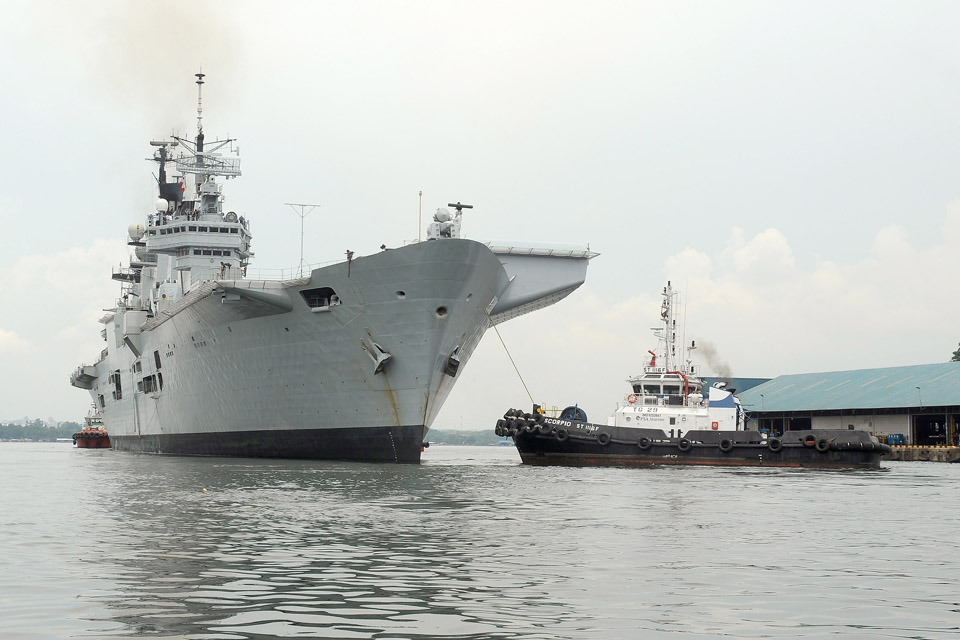 Tug boats escort HMS Illustrious safely from her berth at Sembawang in Singapore [All pictures: Leading Airman (Photographer) Nicky Wilson, Crown copyright]