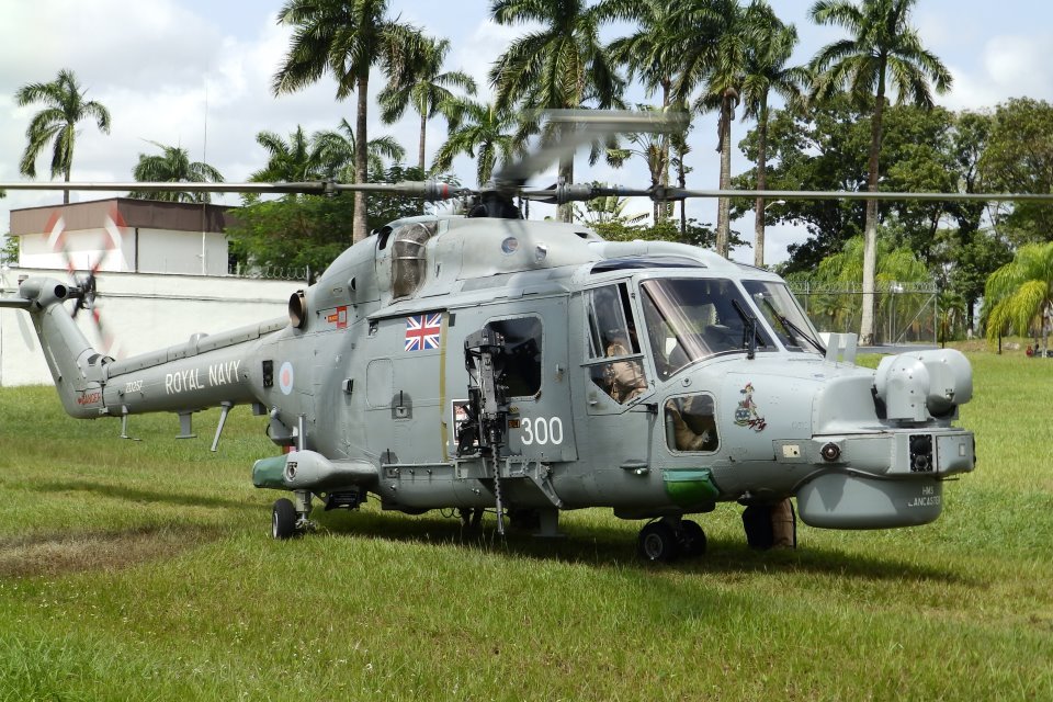 Lynx helicopter from HMS Lancaster lands directly behind the British High Commission compound in Belmopan.
