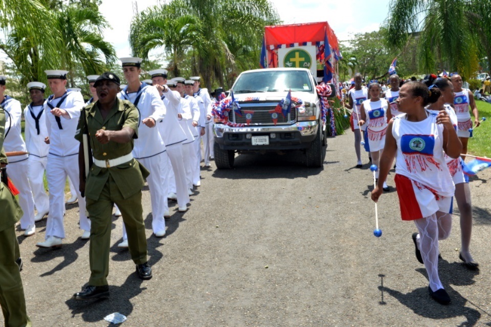 Sailors from HMS Lancaster parade through Belize's capital, Belmopan during the Independence Day celebrations held on 21 September 2013.