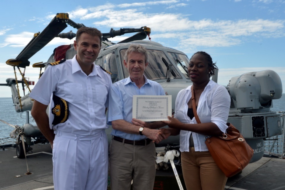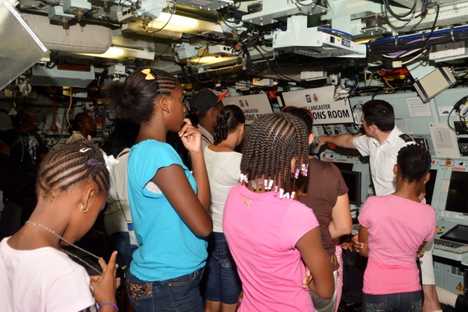 Lancaster’s Commanding Officer, Commander Steve Moorhouse welcomed the British High Commissioner Peter Hughes OBE and the visiting Defence Attaché from Jamaica, Lt Col Patrick Brown onboard as soon as all necessary anchoring tasks were completed then the trio headed ashore for an afternoon of official calls. Later that evening the Commander attended a reception and flag raising ceremony hosted by the Governor General, Sir Colville Young GCMG MBE.